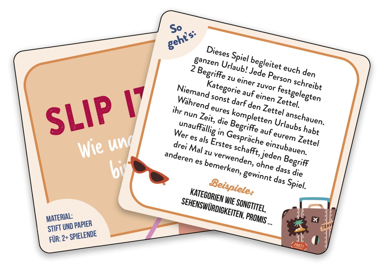 25 unterschiedliche Spiele-Ideen warten auf euch in dieser tollen Box. Bildet eine Promi-Kette, beschäftigt euch mit einem erfundenen Reise-Dilemma oder erratet die grössten Sommer-Hits: Bei allen Spielen braucht ihr nur euch selbst, keine aufwendigen Materialien oder Gadgets werden benötigt. Für einen entspannten und abwechslungsreichen Weg in den Urlaub, ganz egal, ob ihr zu zweit oder in einer grösseren Gruppe unterwegs seid. Natürlich könnt ihr die Anleitungen auch als Familie nutzen!