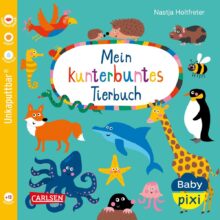 Welche Tiere kennst du schon – grosse und kleine, laute und leise? Tiere hoch in der Luft oder tief unten im Meer? Komm mit in die kunterbunte Tierwelt und lerne sie alle kennen. Ein farbenfroher Spass für klein und gross. Baby Pixi für die ganz Kleinen: Das innovative Material ist wasserfest, schadstofffrei und reissfest. Baby Pixi – einfach unkaputtbar.