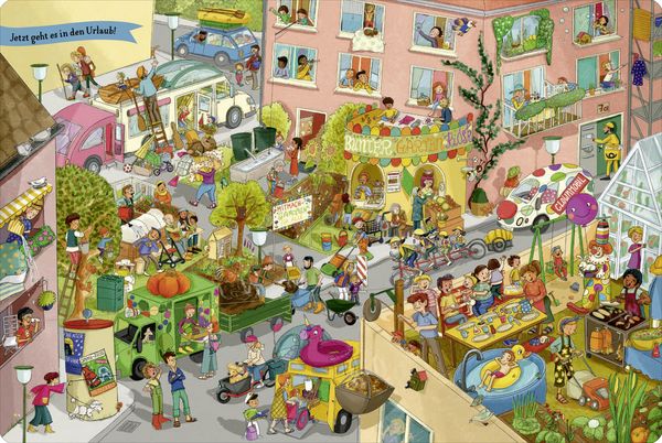 Los geht die Fahrt mit dem verrückten Camper! In lustigen Wimmelbildern und detailreichen Szenen lassen sich immer wieder neue Geschichten entdecken: Wie viele Dinge passen in ein Reisemobil? Wohin fährt das Einhorn-Badetier? Und was stellen die Waschbären auf dem Campingplatz an? Von Seite zu Seite schauen wir Familien und Freunden beim chaotischen Packen, beim Familienfest im Tinyhouse oder beim Übernachten im Baumkronen-Hotel zu. Und am Ende kommen alle endlich am Meer an! Und wer am Ende noch nicht genug unterwegs war, darf mit den Suchfragen von der letzten Doppelseite nochmal auf Reise durch die Wimmel-Bilder gehen!