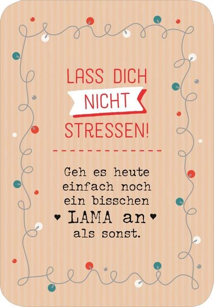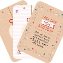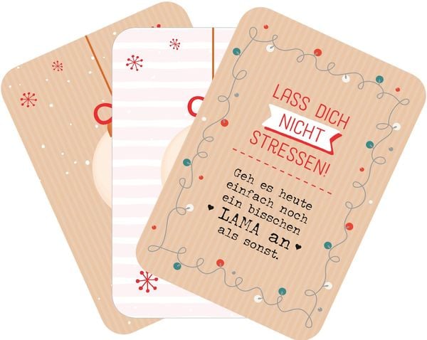 Dieser witzige Adventskalender im Taschenformat zeigt dir, wie du in der Weihnachtszeit unnötigen Stress vermeidest und von Tag zu Tag relaxter wirst! So kannst du dich auf das Wesentliche konzentrieren und die Adventszeit lamamässig entspannt geniessen. Wenn das nicht der Geist der Weihnacht ist … ? Ein schönes Vor-Weihnachtsgeschenk für alle, die man gernhat!