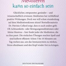 Glücklicher, entspannter, gesünder – und wissenschaftlich erwiesen: Meditation hat verblüffend positive Wirkungen. Doch wer will schon stundenlang auf dem Meditationskissen sitzen? Bestsellerautorin Dr. Patrizia Collard zeigt, dass es auch anders geht. Ob Achtsamkeits- oder Bewegungsmeditationen oder kleine Mantras – hier findet jeder die Meditation, die zu ihm passt. Die einfachen Übungen machen Spass und sind äusserst effizient: Schon 5 bis 10 Minuten am Tag reichen aus, um das Immunsystem zu stärken, Stress abzubauen und den Kopf wieder frei zu kriegen.