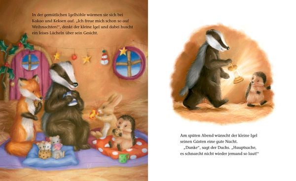 Der kleine Igel freut sich riesig auf Weihnachten. Vor allem, weil seine Freunde schon vorher zu ihm kommen und sie gemeinsam alles fürs Fest vorbereiten.