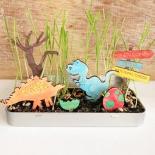 Einfach Erde in die Dose geben, dann die bemalten Requisiten aufstellen und die Weizengrassamen verteilen.