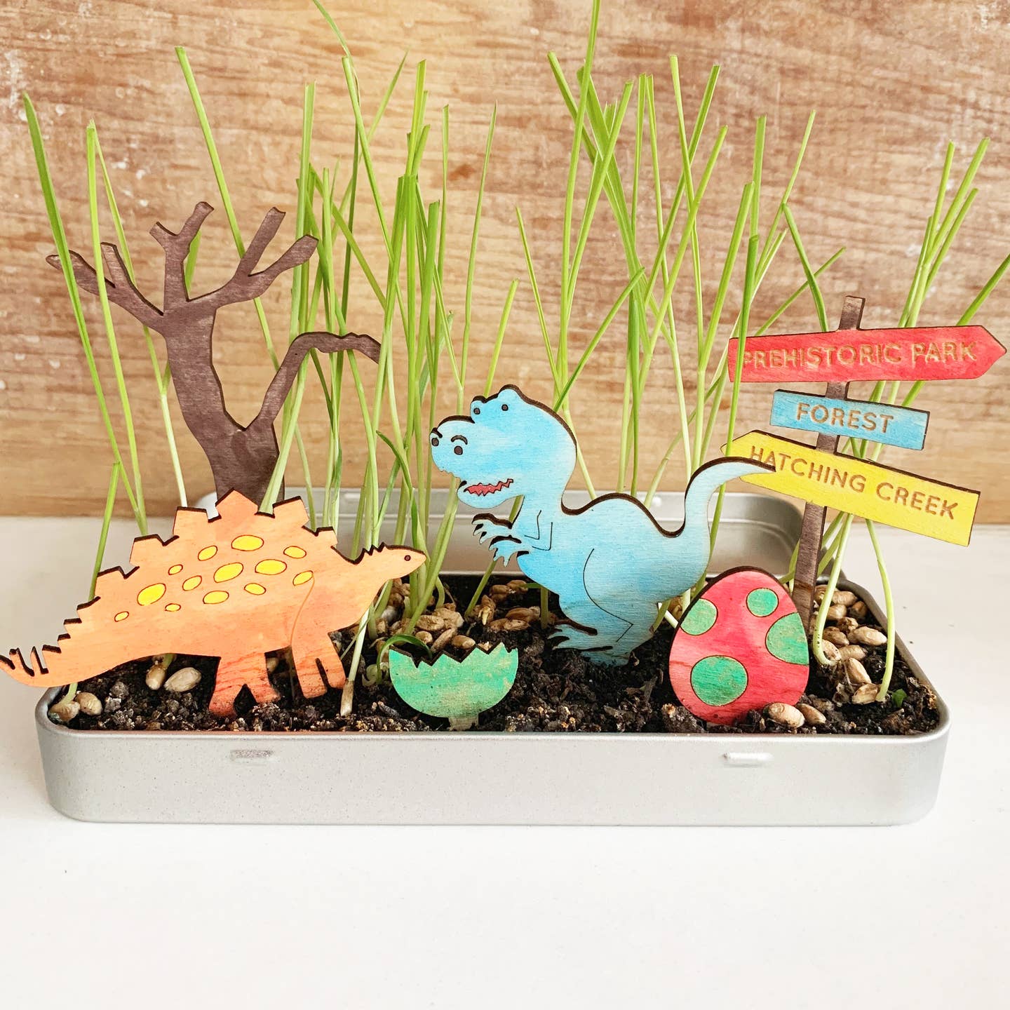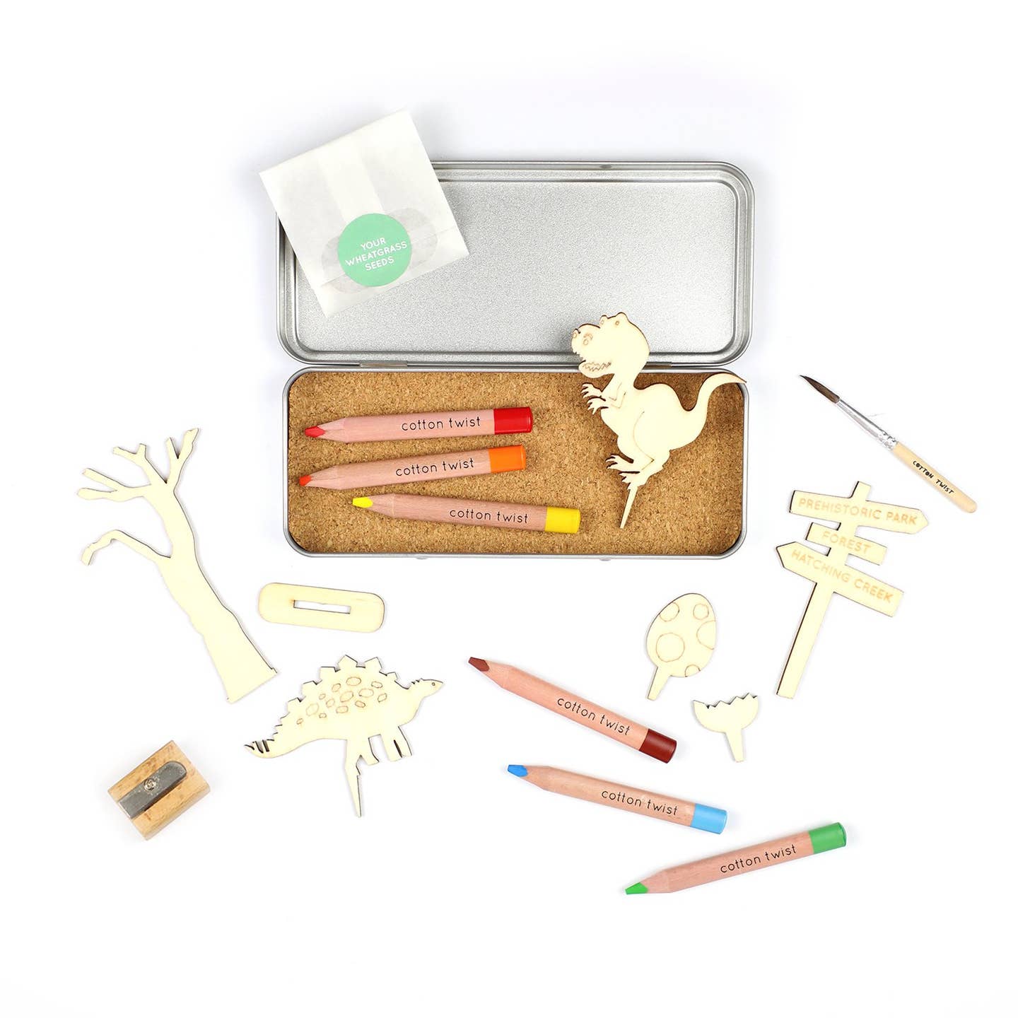 Eine kreative und fantasievolle Dinosaurier-Gartenszene mit Weizengrassamen. Dieses Set enthält Holzformen, riesige Aquarellstifte und einen Pinsel zum Basteln und Zusammenbauen zu einer Dinosaurier-Gartenszene mit einem Stegosaurus, Tyrannosaurus Rex, Eiern und einem Wegweiser. Die riesigen Stifte und der Pinsel bieten eine großartige Gelegenheit, mit dem Mischen von Farben zu experimentieren, und jede Packung wird mit einem Spitzer geliefert.