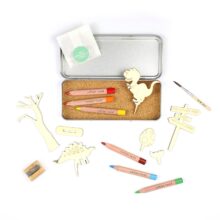 MATERIALIEN: Aquarellstifte, Spitzer, Holzpinsel, Holzdübel, geschnittene Sperrholzformen, Bindfäden, Weizengrassamen
