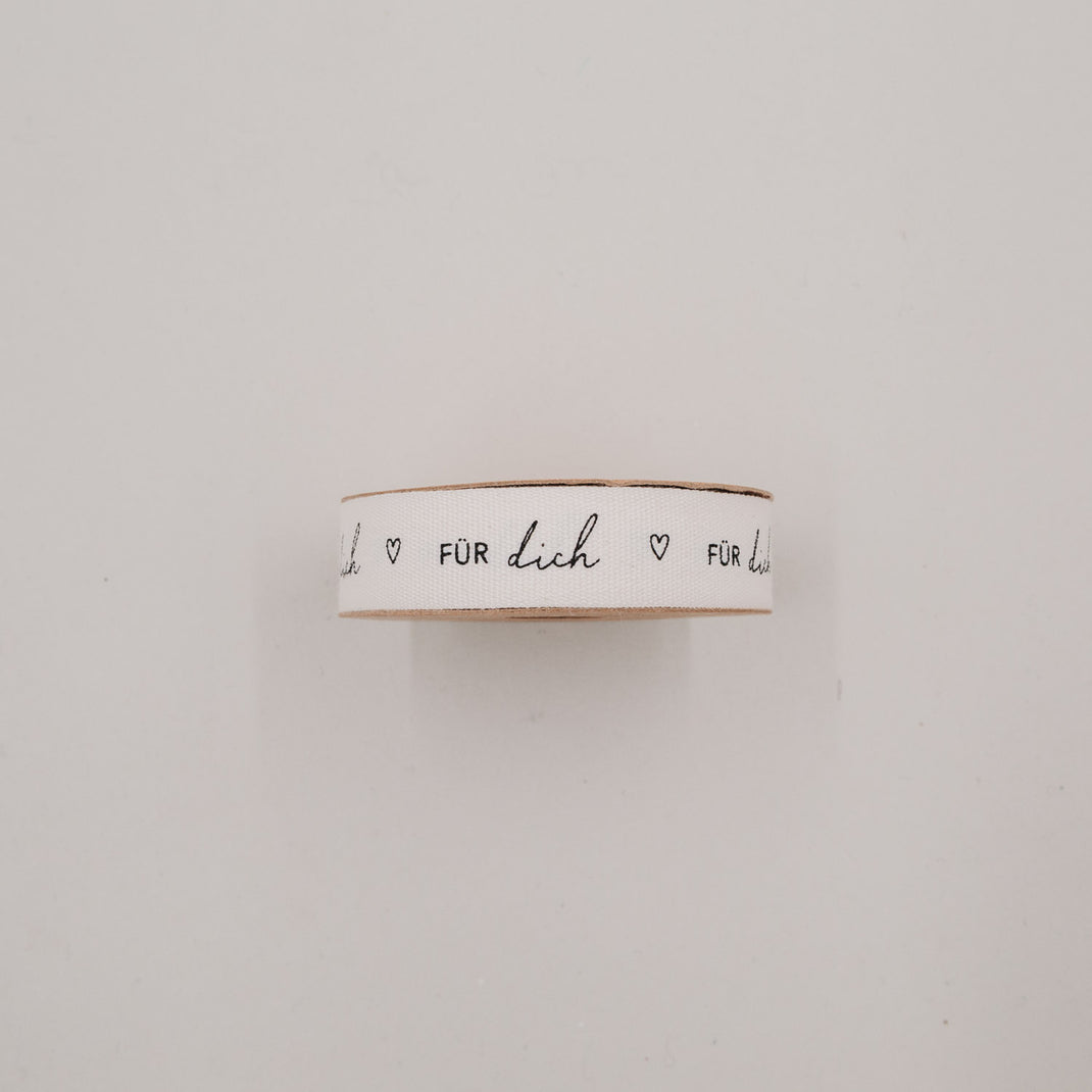Das feine beige Band ziert der schwarze Schriftzug „Für dich“, der dezent und doch ausdrucksstark deine Botschaft unterstreicht. Ob für Geschenke, zum Dekorieren oder Basteln – dieses Band bringt Natürlichkeit und Herz in jedes Detail.
