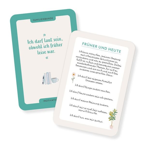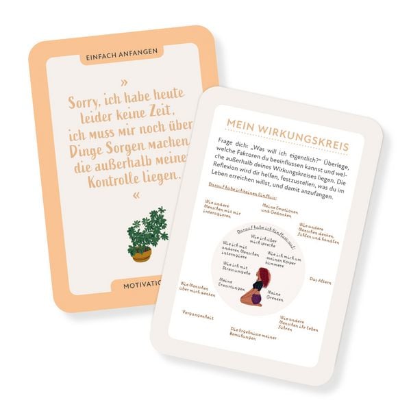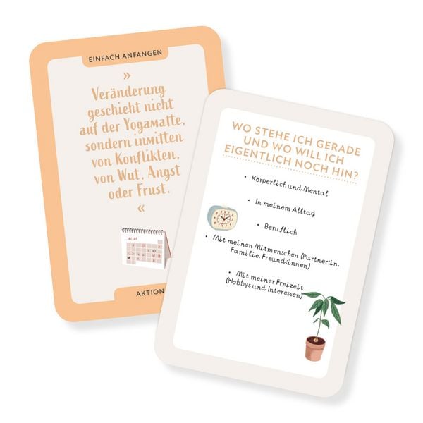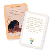 Dieses Kartenset ist der ultimative Begleiter, um Struktur und Klarheit in verschiedenen Lebensbereichen zu schaffen – seien es der Umgang mit Emotionen, Kommunikationsprobleme, Prokrastination oder das Schaffen von Ordnung. Die Motivationskarten inspirieren mit lebensnahen Zitaten und ermutigen durch praktische Hilfestellungen dazu, das gewählte Thema direkt anzugehen. Die Affirmationskarten empowern mit bestärkenden Worten, die als tägliches Mantra genutzt werden können. Die Aktionskarten bringen einen mit kraftvollen Zitaten, konkreten Reflexionsfragen, Übungen oder To-do-Vorschlägen ins Handeln. So einfach kann der erste Schritt zu einem Leben mit mehr Klarheit und Selbstbestimmung sein!
