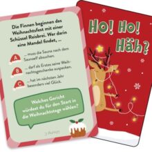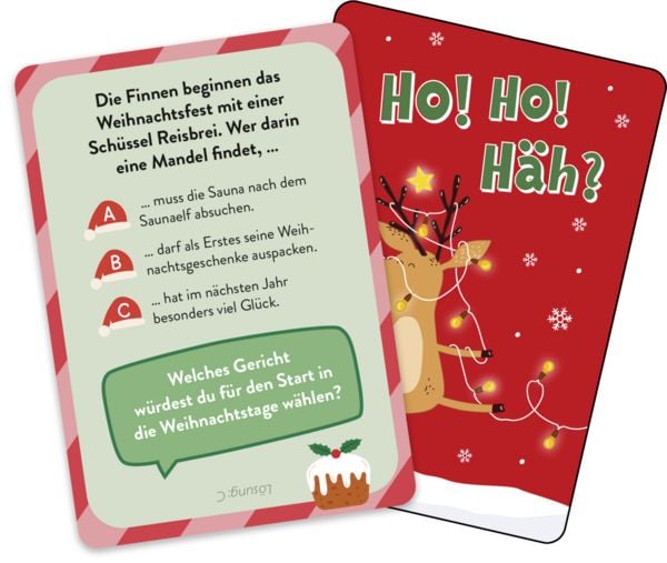 Es gibt viele spannende und kuriose Fakten über Weihnachten und die Adventszeit, von denen du sicher noch nie gehört hast. Oder weisst du, wie der isländische Weihnachtsgesell Askasleikir auf Deutsch heisst? Bei diesem fröhlichen Familienquizspiel mit 51 Karten kannst du allerhand Neues über Weihnachten lernen und dabei eine Menge Spass haben. Finde einfach heraus, welche Antwort (a, b oder c) die richtige ist. Doch pass auf: Falsche Antworten können Minuspunkte geben! Solltest du mal eine Frage gar nicht beantworten können, kannst du stattdessen eine der vielen weihnachtlichen Aufgaben lösen. Dadurch lässt sich das Spiel auch gut mit kleinen Weihnachtsfans spielen.