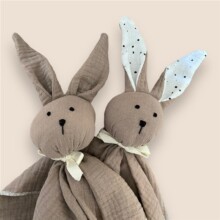 Der kleine niedliche Hase besteht aus weichem Baumwollmusselin. Es eignet sich hervorragend zum kuscheln. Der wattierte Kopf mit den langen Ohren lädt zum anfassen ein und fördert zugleich die Greiffähigkeit Ihres Babys.