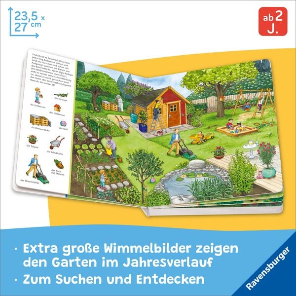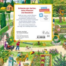 Im Frühling gibt es im Garten viel zu tun und die Natur erwacht langsam zum Leben. Schon sind die ersten Beeren reif und bald wird der Garten im Sommer mit Leben erfüllt. Hier wird gemeinsam gearbeitet, gespielt und gefeiert. Gäste werden eingeladen und die Freunde der Kinder kommen zum Spielen vorbei. In der Nacht wagt sich die Igelfamilie hervor und erkundet die Wiese. Die Familie macht einen Ausflug in den Botanischen Garten und so lernen die Kinder auch Pflanzen und Tiere aus fremden Ländern kennen. Ein Besuch in der Kleingartensiedlung zeigt, wie andere Familien leben und gärtnern, und im Kindergarten gibt es eine Einladung zum Familientag. Zusammen mit dem beliebten “Sachen suchen”-Spieleffekt schenkt dieses Buch Einblick in unterschiedliche Naturerlebnisse, zeigt Vielfalt und macht Lust darauf, Pflanzen und Tiere beim Namen zu nennen. Ein erstes Kindersachbuch für die ganze Familie.