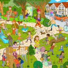 Der Frühling ist in die kleine Stadt eingezogen: Alle gehen hinaus, um die ersten Sonnenstrahlen zu geniessen. Die Kinder spielen im Park, Opa Willi geht mit Dackel Karlchen spazieren und ein paar Kaninchen hoppeln über die Wiese. Überall blüht, brummt und zwitschert es, das Eiscafé ist geöffnet und Gross und Klein begrüsst den Frühling.