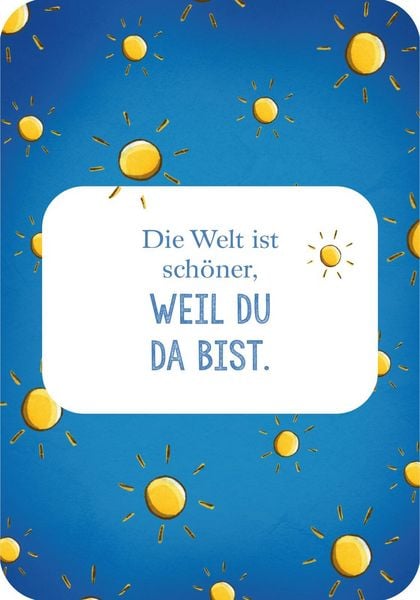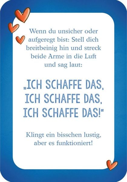 In dieser liebevoll gestalteten Kartenbox befinden sich 50 Affirmationskarten für Kinder. Perfekt geeignet als Mutmacher für den Schulstart, aber auch für andere Situationen, wie den Eintritt in den Kindergarten, einen aufregenden Auftritt, einen Umzug etc.