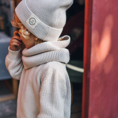Der Loop Schal ist aus kuscheligem Bio Strick und schmiegt sich wärmend an den Hals an.