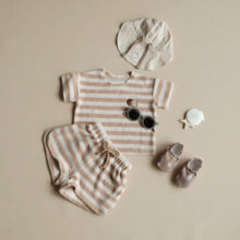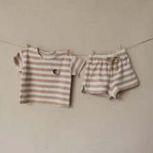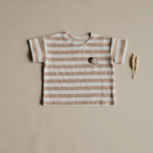 Kuschelig weiches Oversize Shirt aus GOTS-zertifiziertem Bio Teddy Stoff in unserer exklusiven Farbe Latte Striped und einer niedlichen Kokosnuss eingestickt.