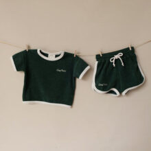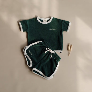Kuschelig weiche Shorts aus GOTS-zertifiziertem Bio-Frottee in unserer exklusiven Farbe Vintage Green.