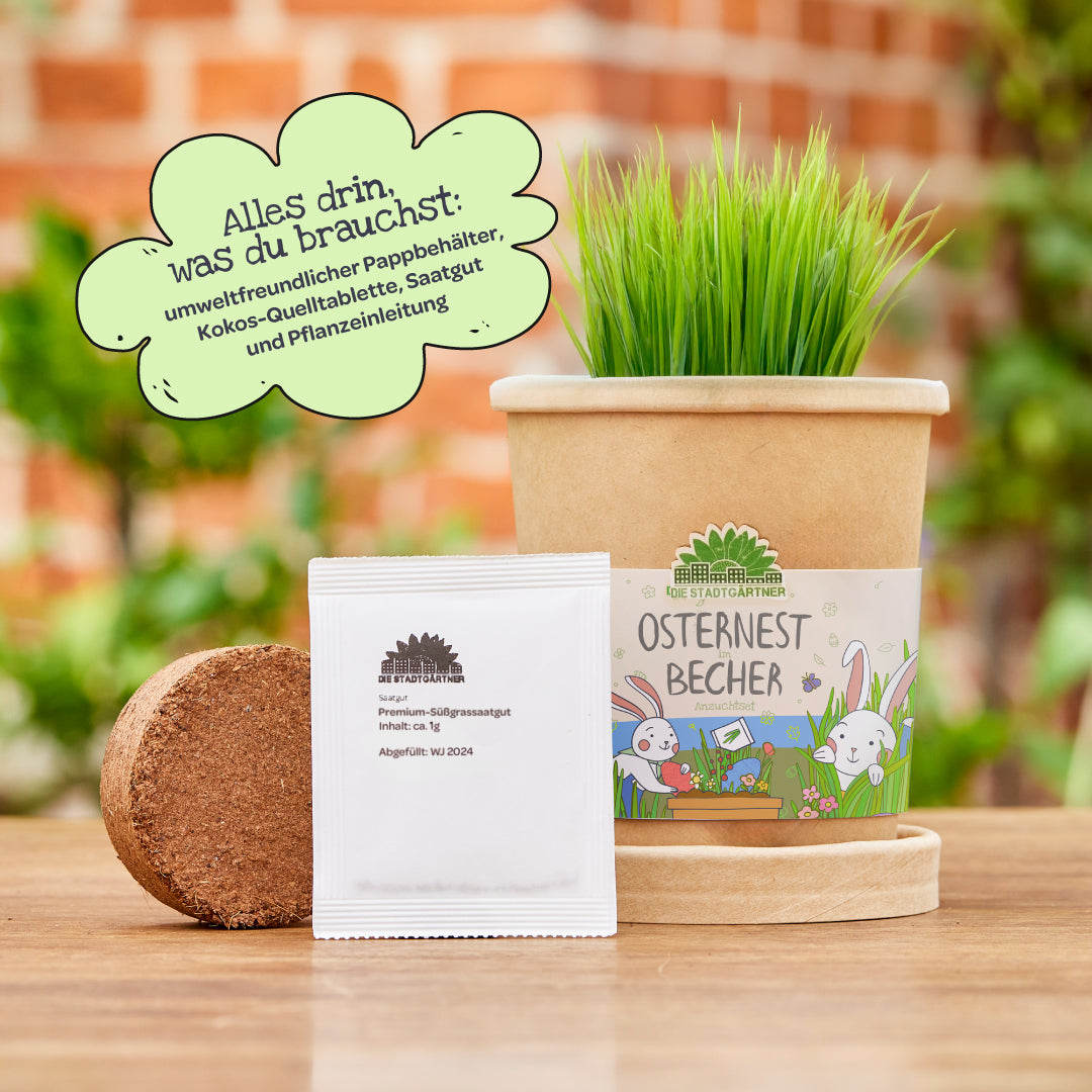 Der umweltfreundliche Anzuchtbecher enthält eine Kokos-Quelltablette und hochwertiges Ostergras-Saatgut. Perfekt für Balkon, Garten oder Fensterbank – kinderleichte Anwendung und ein schönes Naturerlebnis für Groß und Klein.