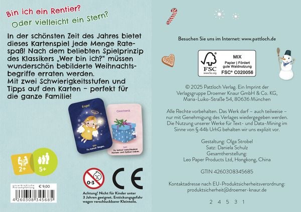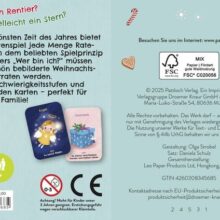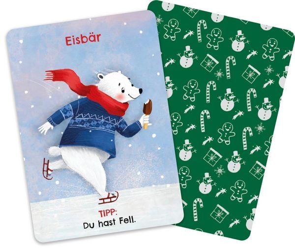 Bin ich ein Rentier? Oder vielleicht ein Stern? Wenn die kalten Adventssonntage lang werden oder an Heiligabend die ganze Familie beisammensitzt, bietet dieses Kartenspiel ab 5 Jahren jede Menge Ratespaß! Nach dem beliebten Spielprinzip des Klassikers "Wer bin ich?" müssen anhand von Ja-Nein-Fragen wunderschön illustrierte Weihnachtsmotive erraten werden. Zwei unterschiedliche Schwierigkeitsstufen, Tipps auf den Karten und eine klare Bildsprache garantieren großen Spielspaß für Jung und Alt – jede*r kann mitmachen, auch ohne schon lesen zu können! Das ideale Familienspiel für die schönste Zeit des Jahres!