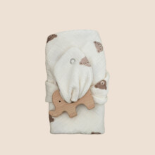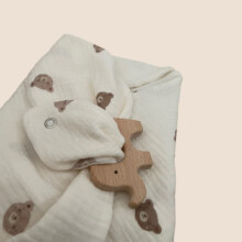 Weiches Schmusetuch aus zweilagigem Musselin mit Holzgreifling, beruhigt das Baby und schafft eine emotionale Bindung.