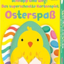 Bei diesem Kartenspiel sind Konzentration und Schnelligkeit gefragt. Wer entdeckt zuerst zwei gleiche Osterei-Karten auf dem Tisch und reagiert am schnellsten? Wer am Ende alle Karten hat, gewinnt. Die fröhlichen Oster-Motive machen dieses Spielerlebnis für zwei oder mehr Personen komplett. Schnapp und Weg! ist ein Spiel für zwei oder mehr Spielerinnen und Spieler. Es besteht aus 52 eiförmigen Spielkarten (je vier Karten zeigen das gleiche Motiv).
