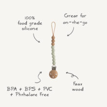Mit einer Schnullerkette wird der Schnuller Ihres Babys sicher an seiner Kleidung befestigt. Der Schnullerkette verhindert, dass der Schnuller verloren geht oder auf den Boden fällt, und er ermöglicht Ihrem Baby bei Bedarf einen einfachen Zugang zum Selbstberuhigen. Der Clip sorgt dafür, dass der Schnuller immer in der Nähe ist. Kombinieren Sie den Clip mit dem Lieblingsschnuller Ihres Babys.