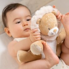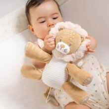 Die kuschelige Spieluhr lädt mit einer beruhigenden Melodie zum Träumen ein. Das Tier besteht aus weichem Stoff.
