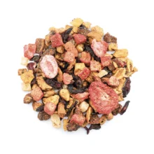Apfelstücke, Hibiskusblüten, Ananaswürfel (Ananas, Zucker, Säuerungsmittel: Citronensäure), gesäuerte Apfelstücke (Apfel, Säuerungsmittel: Citronensäure), Aroma, süße Brombeerblätter, Maracujaflocken (Maracujasaftkonzentrat, Maisstärke), gefr.-getr. Erdbeerscheiben, gefr.-getr. Erdbeerstücke.