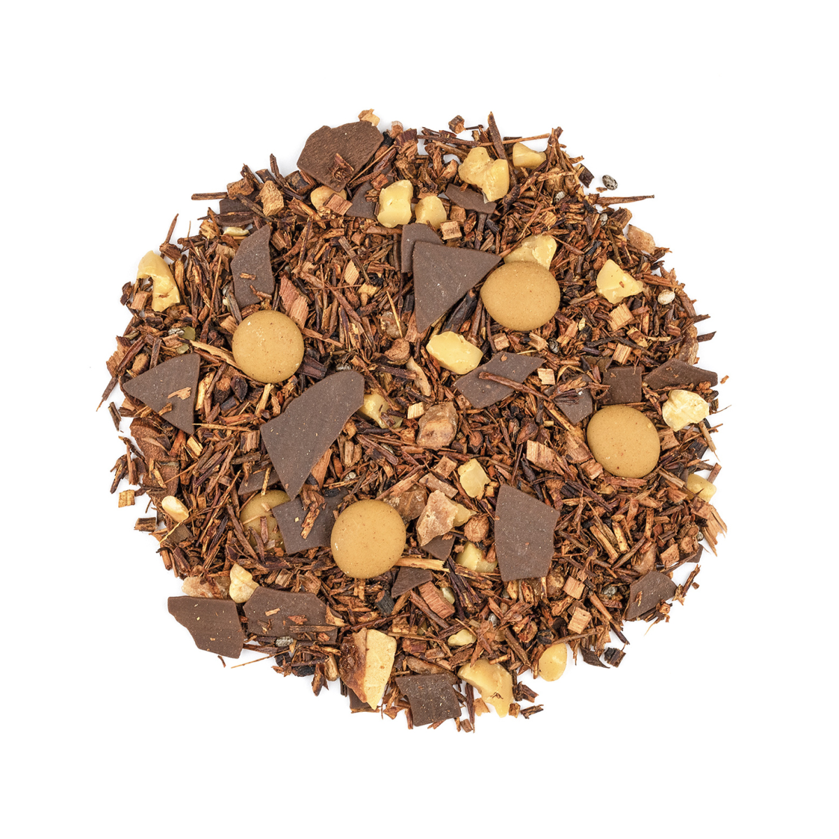 Rooibos (geschützte Ursprungsbezeichnung), Honeybush, dunkle Schokoraspel (Zucker, Kakaomasse, fettarmes Kakaopulver, Kakaobutter, Emulgator: Sonnenblumenlecithin) (12,5%), Schokoladentropfen Karamell (Zucker, Kakaobutter, VOLLMILCHPULVER, fettarmes Kakaopulver, Emulgator: Sonnenblumen-Lecithin, Aroma, Farbstoff: Paprikaextrakt), MANDELN, karamellisierte Mandel (Zucker, MANDELN, Wasser, Verdickungsmittel: Gummi arabicum, Vanille), Chiasaat, natürliches Aroma, Aroma.