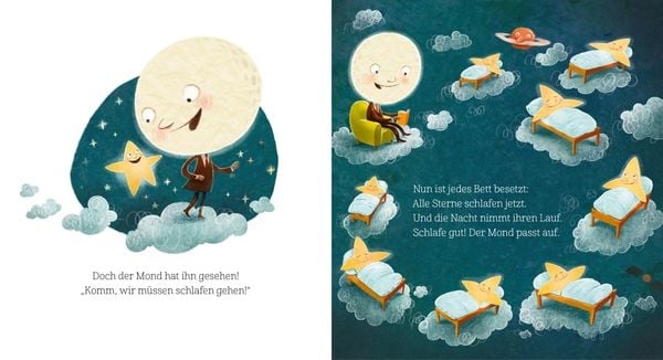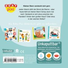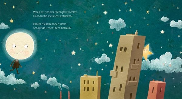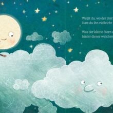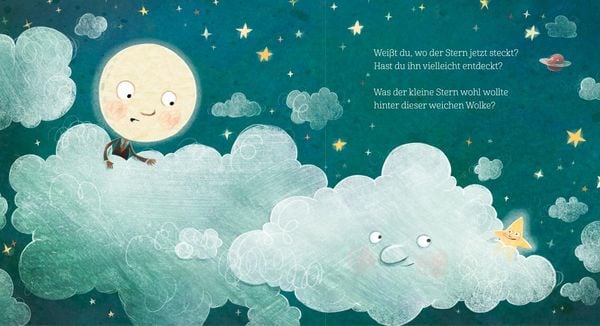 Jeden Abend zählt der Mond die Sterne – aber heute fehlt ein kleiner Stern! Schau doch mal nach: Versteckt er sich etwa zwischen den Planeten? Hinter dem grossen Haus? Oder etwa in der weichen Wolke? Eine traumhaft schöne Einschlafgeschichte für alle Kleinen, die noch gar nicht müde sind…