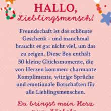Freundschaft ist das schönste Geschenk – und manchmal braucht es gar nicht viele Worte, um das zu zeigen. Mit dieser liebevoll gestalteten Kartenbox verschenkst du 50 kleine Glücksmomente, die von Herzen kommen: charmante Komplimente, witzige Sprüche, freche Statements und emotionale Botschaften, die das Band zwischen dir und deinen Freund:innen noch stärker machen. Perfekt zum Verschenken, Verschicken oder als kleine Überraschung zwischendurch – für alle, die das Leben gemeinsam feiern!