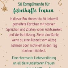 Diese Box mit 50 Kärtchen voller Komplimente ist ein wunderbares Geschenk für fabelhafte Frauen. Eine charmante Liebeserklärung, die allen wichtigen Frauen in deinem Leben ein Lächeln auf die Lippen zaubert. So wird ihr stressiger Alltag leichter und schöner!