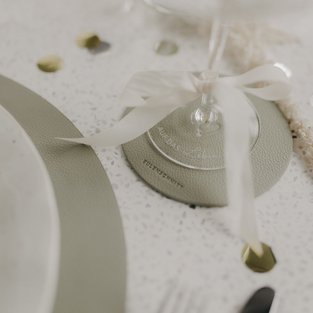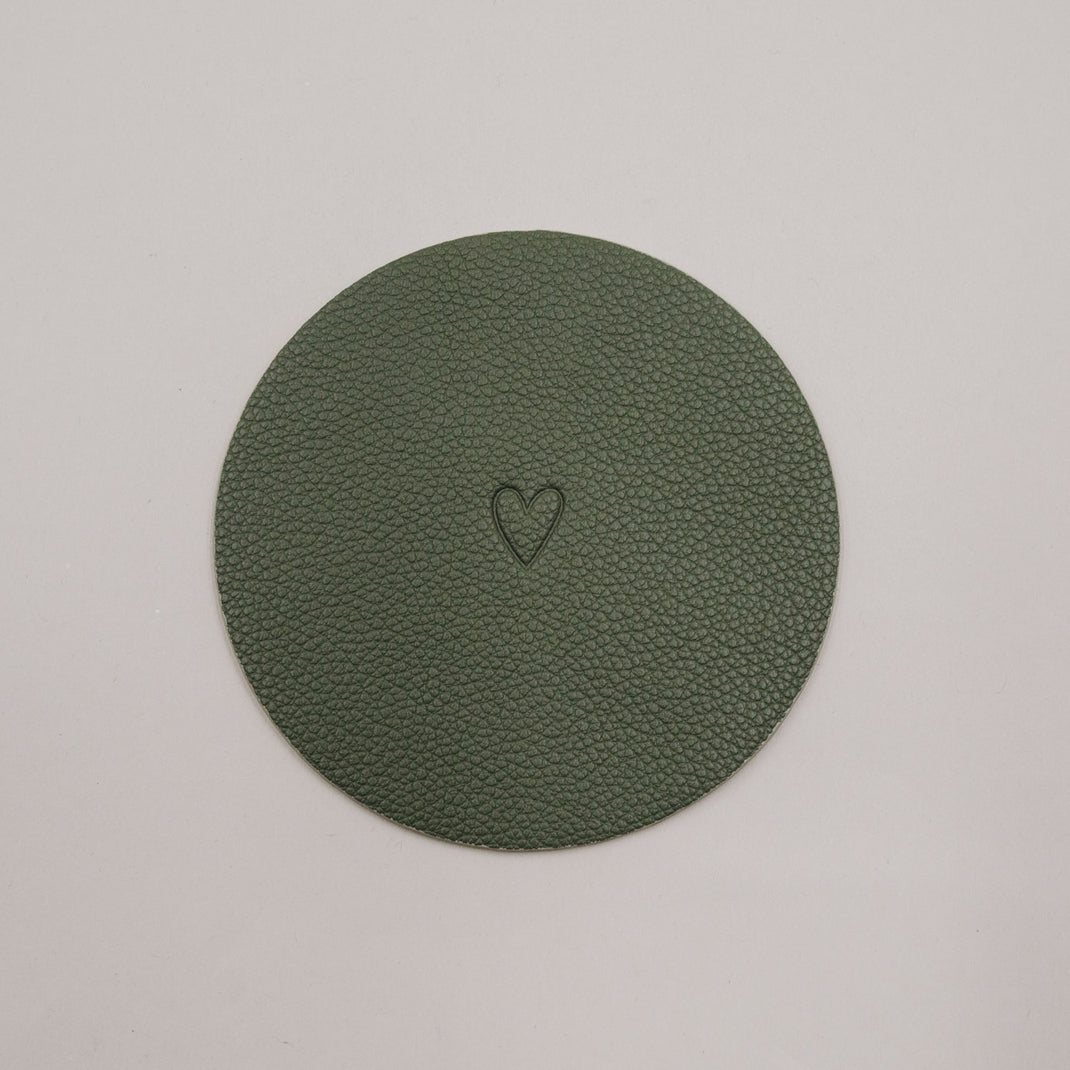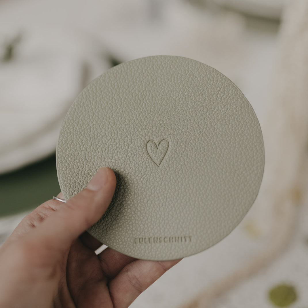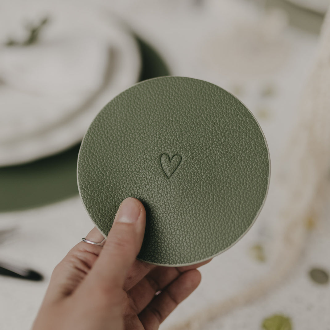 Beide Untersetzer sind beidseitig verwendbar und mit einem fein eingeprägten Herzmotiv versehen, das jedem Moment einen besonderen, warmen Akzent schenkt. Auf einer Seite findest du zusätzlich unser dezentes Eulenschnitt-Logo, das dem Design eine hochwertige, unaufdringliche Signatur verleiht. Die beiden Grüntöne harmonieren wunderbar miteinander und passen sich mühelos unterschiedlichen Tischdekorationen – von frisch und modern bis hin zu gemütlich und natürlich – an.