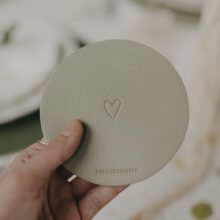 Die perfekten Begleiter zum Servieren von Getränken. Diesen Untersetzer ziert ein kleines Herz auf der Vorderseite und das Eulenschnitt Logo auf der Unterseite. Sie haben einen Durchmesser von 11,2 cm und eine Stärke von 1 cm.