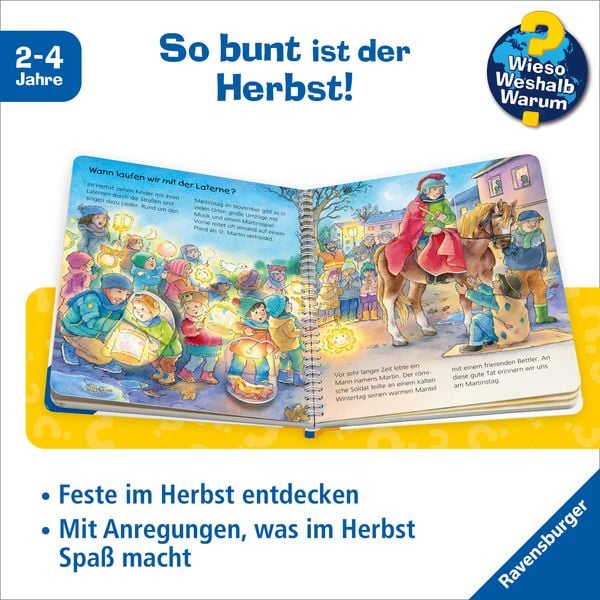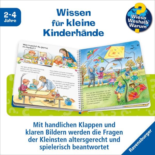 Jonas und Ella lieben es, im Herbst mit Gummistiefeln in Pfützen zu springen und am Waldrand Kastanien zu sammeln. Wenn der Wind ordentlich pfeift, lassen sie ihre Drachen steigen. Ganz besonders freuen sich die beiden darauf, an Halloween verkleidet und am Martinstag mit Laternen durch die Straßen zu ziehen. Und was machen wir im Frühling, Sommer und Winter? Das verraten die weiteren Bände dieser Jahreszeiten Serie von Wieso? Weshalb? Warum?