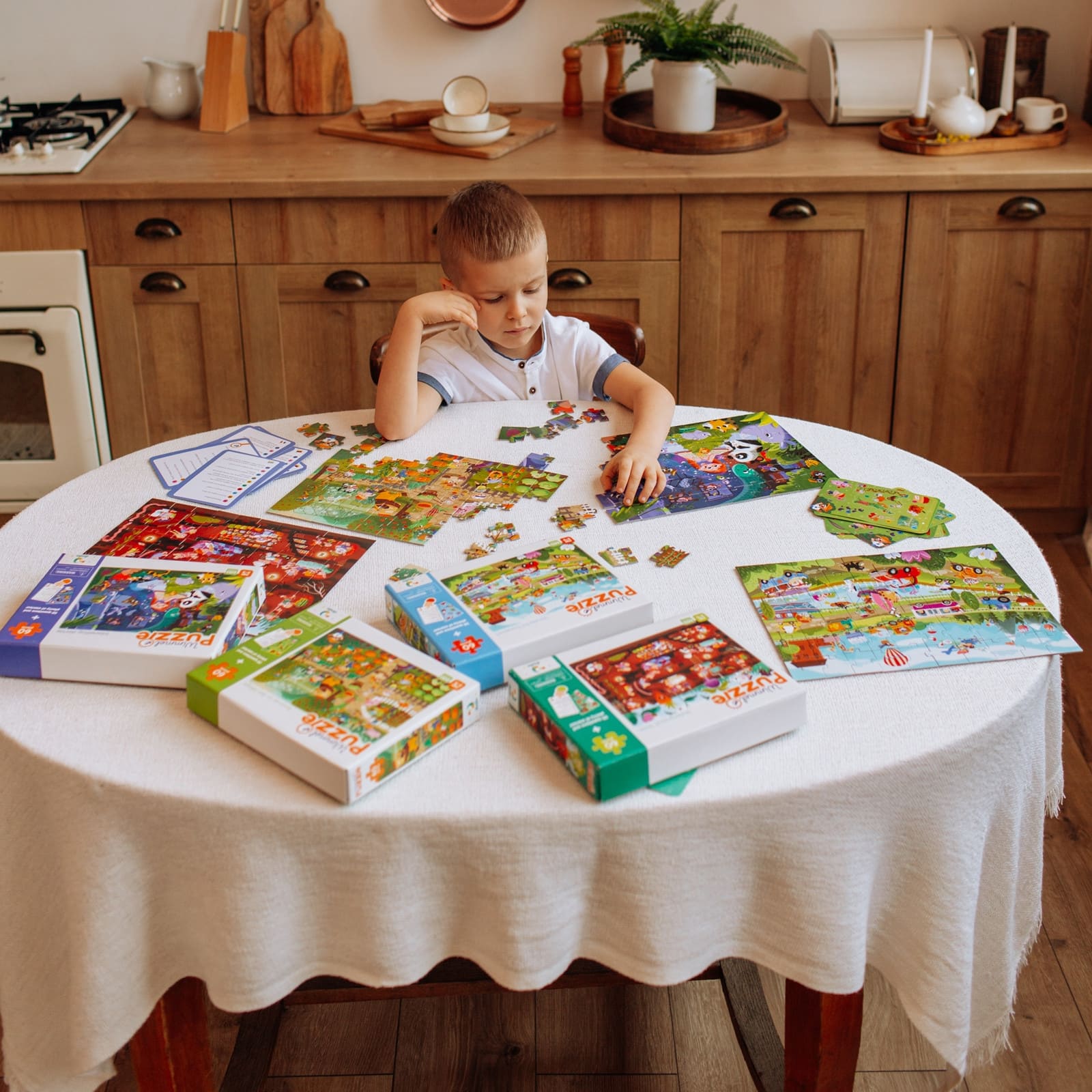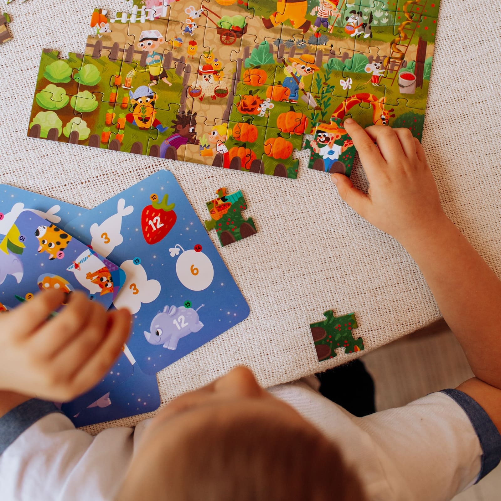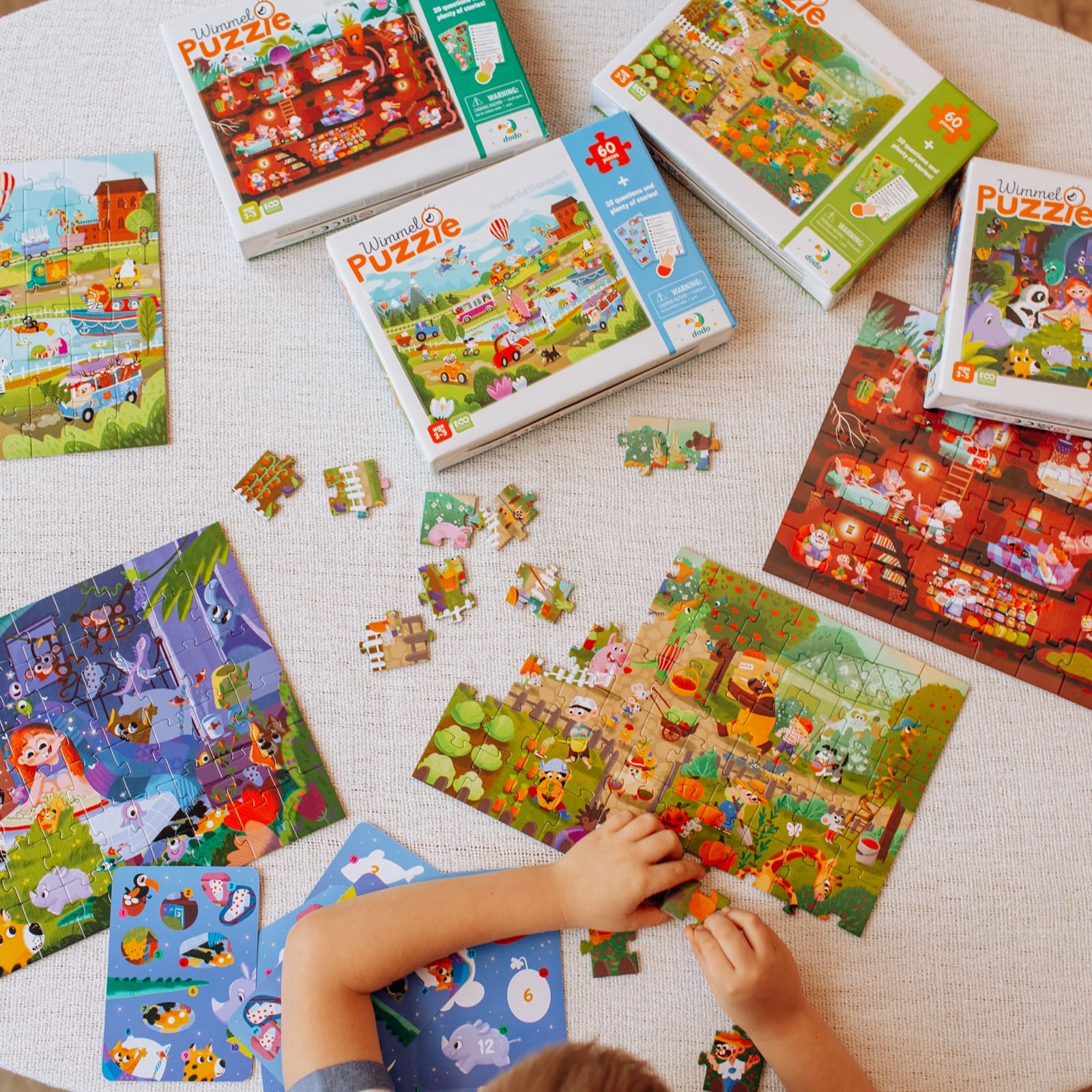 Die Besonderheit eines Wimmelpuzzles liegt in der Anzahl der Elemente auf dem Bild, denn das Puzzle wimmelt förmlich von Figuren. Die Aufgabe des Kindes ist es, die richtige Figur zu finden, die auf der Aufgabenkarte angegeben ist. Das Spielen mit diesem Puzzle lehrt die Kinder, schlau zu sein und sich zu konzentrieren.